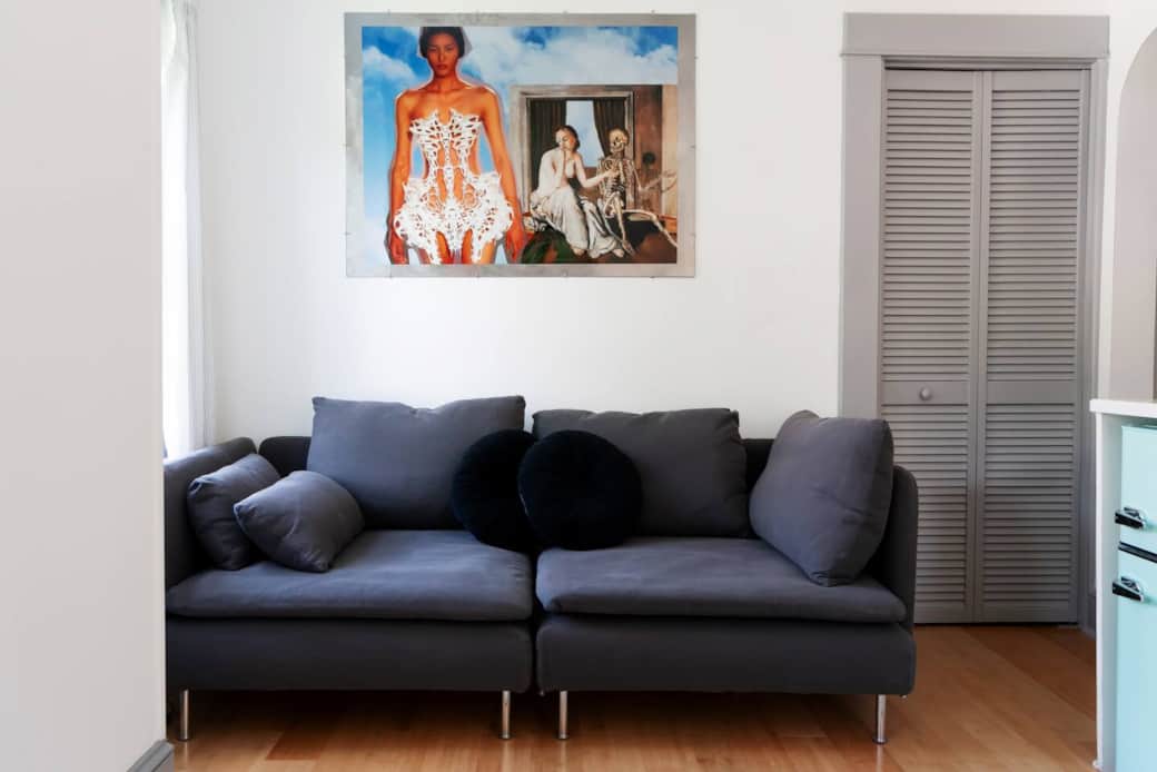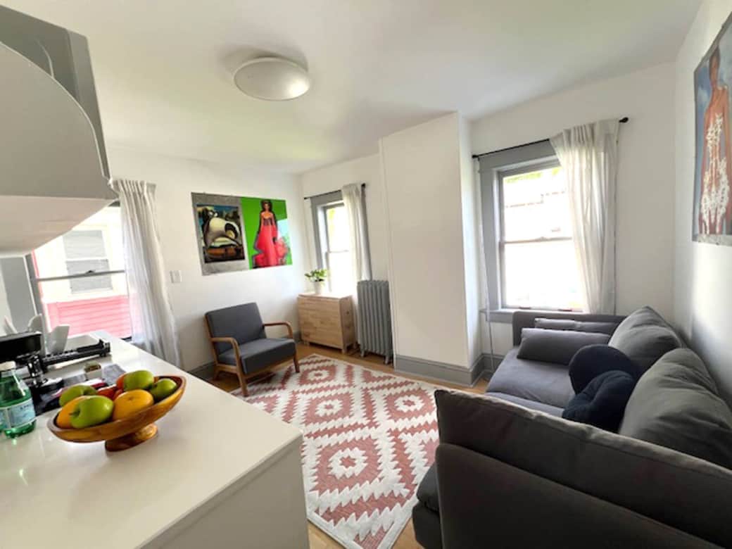 Kitchenette/studio, includes sofa (NOT a sofa bed) and closet, as well as serving counter equipped with sink, mini-fridge, microwave, coffee-maker, hot plate, silverware, dishes and glasses.