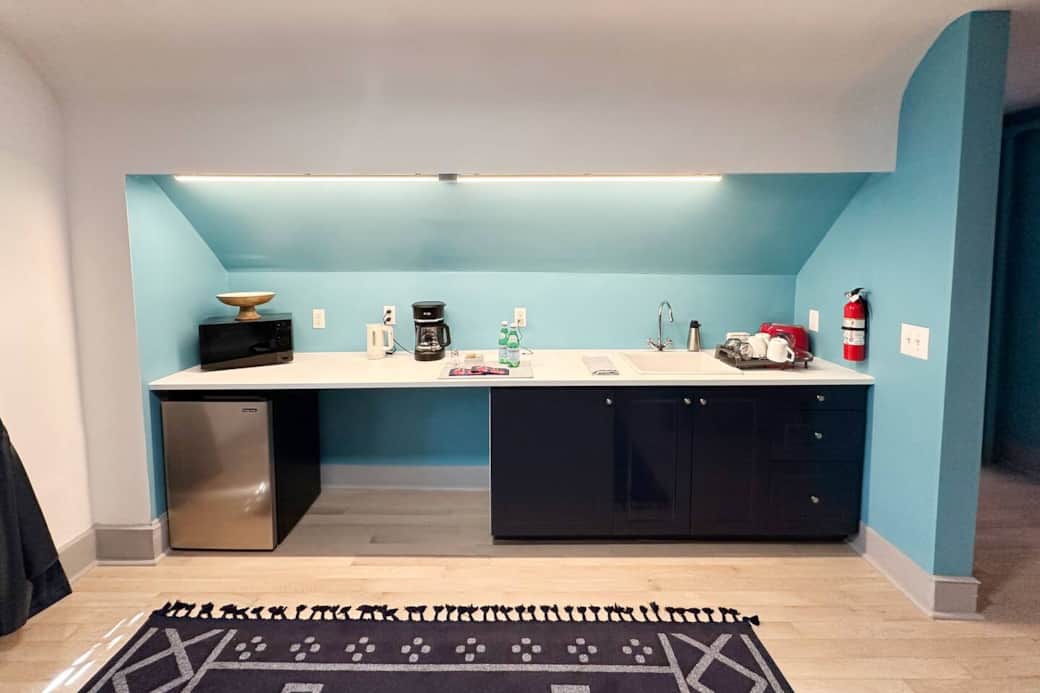 • Living Area/Kitchenette: Features a comfortable Queen-size sofa bed, it also includes a serving counter. Fully equipped with sink, mini-fridge, microwave, coffee-maker, hot plate, silverware, dishes, and glasses