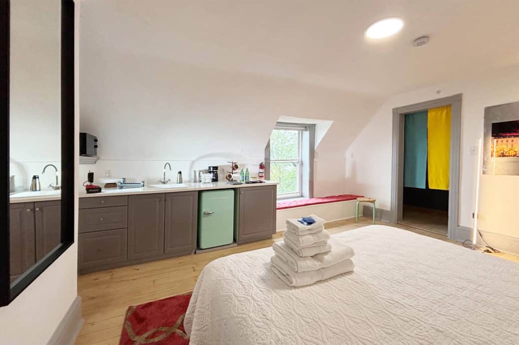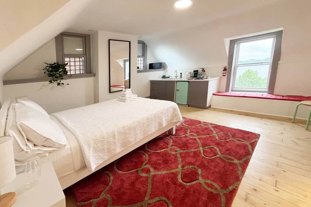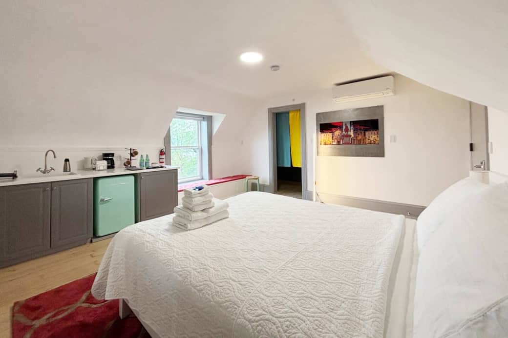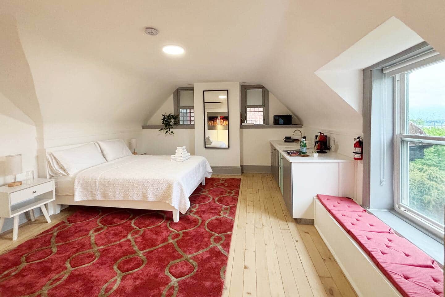• Living Area: Features a comfortable Queen-size and a bench by the window, tastefully furnished, creating a cozy and inviting atmosphere.